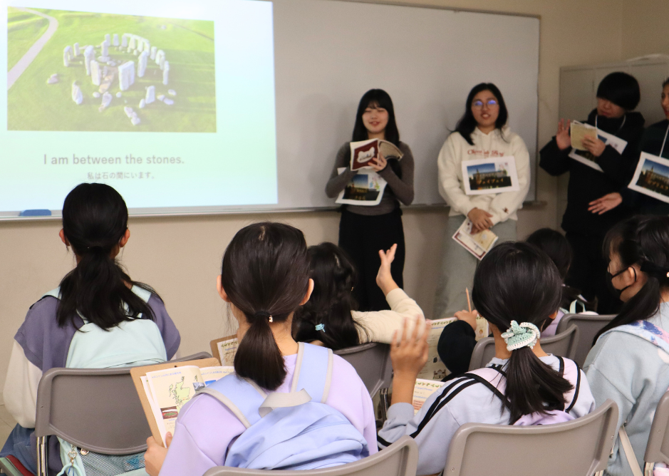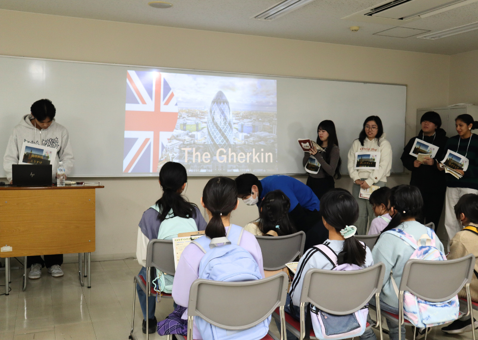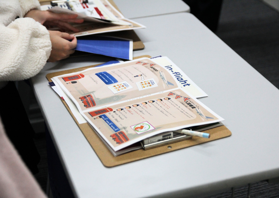 当日は、出国手続きや入国審査、ロンドン観光、ショッピングなど、シーンごとに学生が担当。荷物が超過した場合の英語表現や、機内食の際に使う英語、パスポートの役割を説明する場面、ロンドンの有名スポットを英語で紹介する時間、ケーキ屋さんでのショッピング体験など、実践的な内容が盛りだくさんでした✨